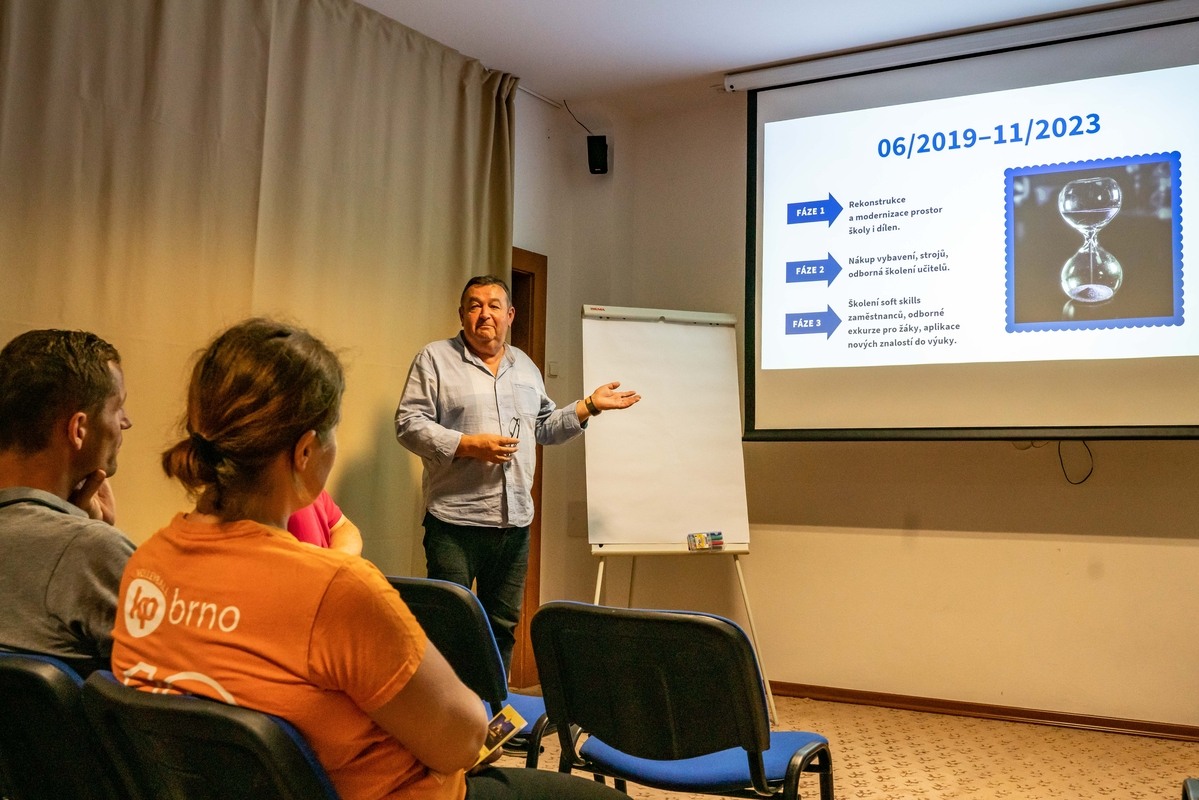 V pátek jsme na hotel dorazili v podvečerních hodinách, ubytovali jsme se, a poté následoval blok přednášek. Hlavním bodem prvního večera byla finální projektová prezentace pana ředitele, která shrnula celý projekt a byla doplněna o fotografie z jeho průběhu. Pan ředitel detailně rozebral časový průběh, přínosy nových aktivit, ale i nezdary, které provázely naši cestu stát se prestižní technickou školou. Po prezentaci následovala dlouhá diskuze účastníků, ze které vzešly dobré podněty pro další rozvoj školy. Mimo jiné ještě více rozpracujeme koncept propojení výuky strojních i elektro oborů, na čemž už nyní pracujeme.