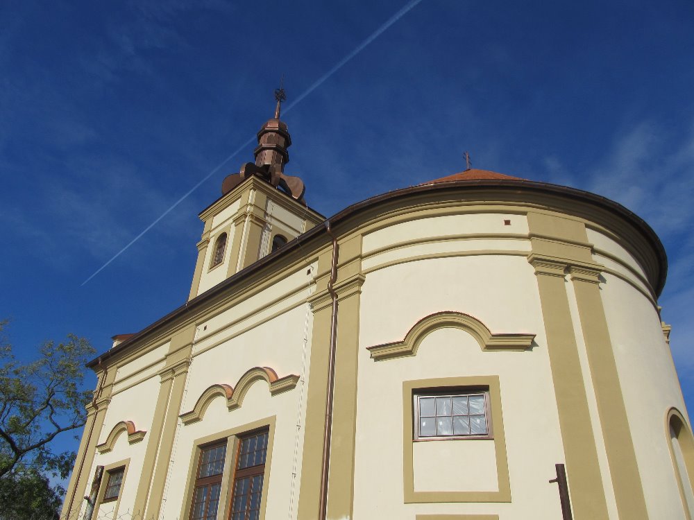 Ale jo, všichni jsme vyfuněli nahoru a ti rychlejší vlezli i nějakým lidem na půdu sklepa! Naštěstí "pod Starým hradem" nikoho nyní dopoledne nepotkáte. Potkali jsme jen stavbaře, kteří opravují kapli sv. Floriána. Tuto zničili Němci, když ustupovali v dubnu 1945 a nyní již září novotou.