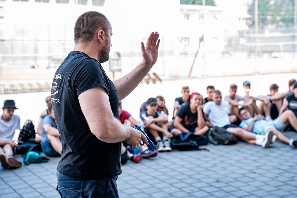 Poslední školní týden jsme v pondělí zahájili sportovně-branným dnem. Během dopoledne se mohli žáci seznámit s netradičními sporty a čekaly je také zajímavé exkurze. Ačkoliv počasí nás atakovalo teplotními rekordy, my jsme se mohli zchladit při ukázce chladných zbraní. Pan učitel Jurčeka nás poutavě provedl historií chladných zbraní, nechal nás si zbraně „osahat“ a se svým pomocníkem (bývalým žákem naší školy) předvedl i praktickou ukázku historických soubojů. O jiném druhu boje se žáci dozvěděli více z přednášky o systému sebeobrany krav maga. I tentokrát se dočkali praktických ukázek a to na sobě samých. Tato přednáška trošku zabolela… Méně bolestivé snad už bylo hraní pétanque, procházka po Uherském Hradišti či výšlap na Rochus. Součástí dne byla i exkurze do hasičárny a do záchranné stanice v nemocnici.
