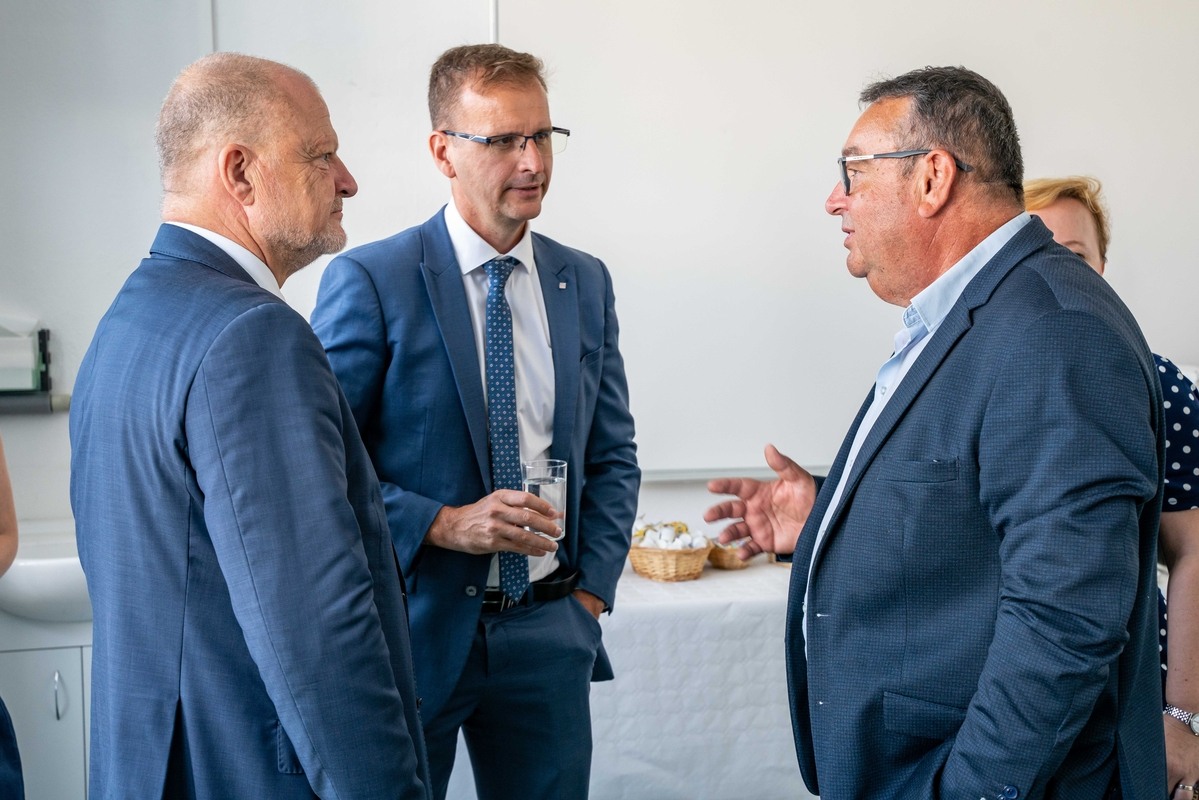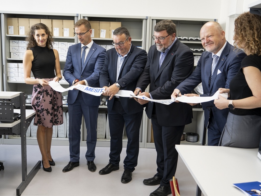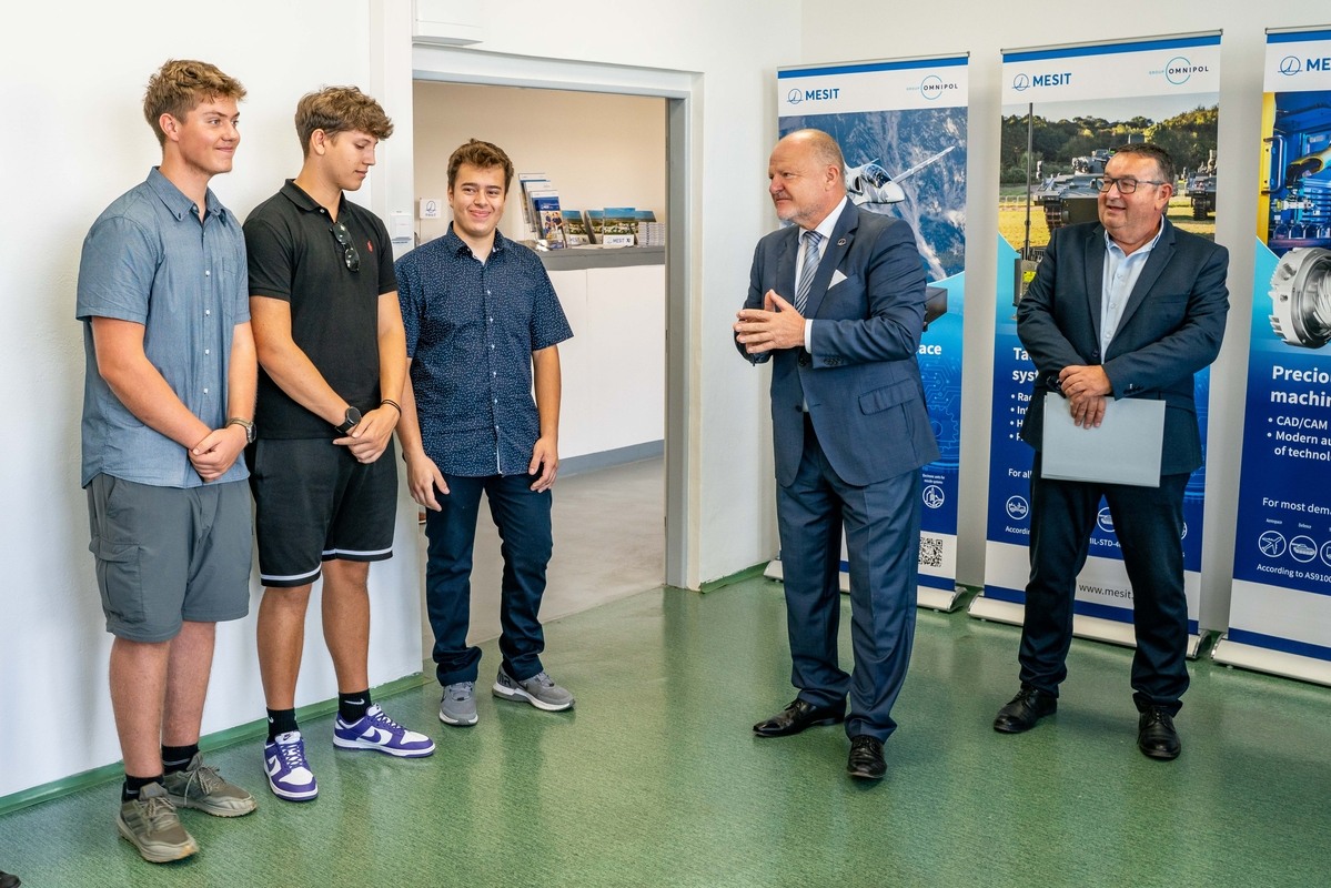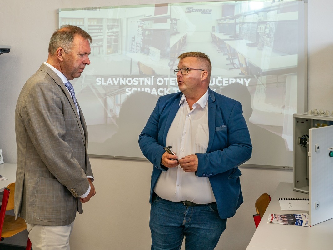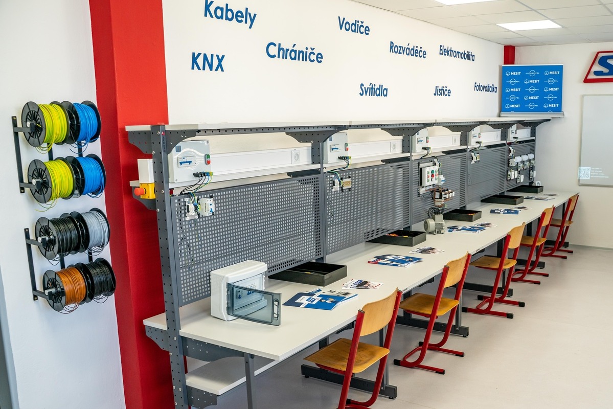 Mezi hosty nechyběli významní představitelé regionu i firmy Schrack Technik a firmy MESIT, člena skupiny OMNIPOL. Společně jsme přestřihli pásku a prohlédli si učebnu, která nabízí moderní vybavení včetně montážních stolů na míru a instalačních elektro prvků, které žáci budou využívat při své práci.