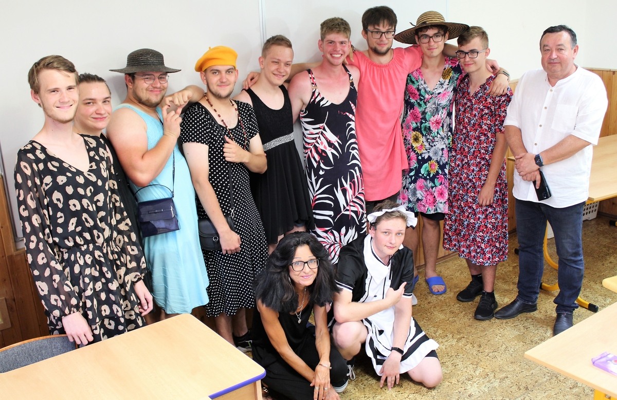 Úterý jsme nazvali zážitkovým dnem a bylo na třídě a jejím učiteli, jaký program si zvolí. Zatímco některé třídy vyrazily na poznávání nedaleké přírodní rezervace zvané „Kanada“, třída 2.E si vyrazila zaskákat do trampolínového centra a žáci třídy 3.AB s jejich třídní učitelkou se vzhledem k tropickému počasí rozhodli strávit společné dopoledne jednoho z posledních dnů letošního školního roku bez jakékoliv fyzické aktivity či adrenalinu, zkrátka v poklidném tempu procházkou a návštěvou výstav ve Slováckém muzeu. Přestože hoši studují obor technického zaměření, umění a kultura jim zdaleka nejsou cizí, dokonce se ukázalo, že by z nich mohly být docela fešné „modelky“. Měli totiž možnost vyřádit se na výstavě dobových oděvů a uznejte sami, že jim to v historických outfitech a s apartními kloboučky na hlavách opravdu moc slušelo! Dopoledne proběhlo v dobré náladě a nechybělo ani závěrečné posezení na zahrádce jedné z místních restaurací u osvěžující domácí limonády a lehkého oběda.